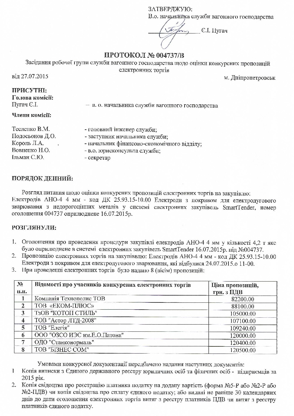 24.07.2015 компанія «Еком-плюс» визнана переможцем редукціону із закупівлі державним підприємством «Придніпровська залізниця» електродів зварювальних у кількості 4,2 тонни. При очікуваній вартості закупівлі 120.500грн. вартість договору з переможцем мала б становити 88.100грн..