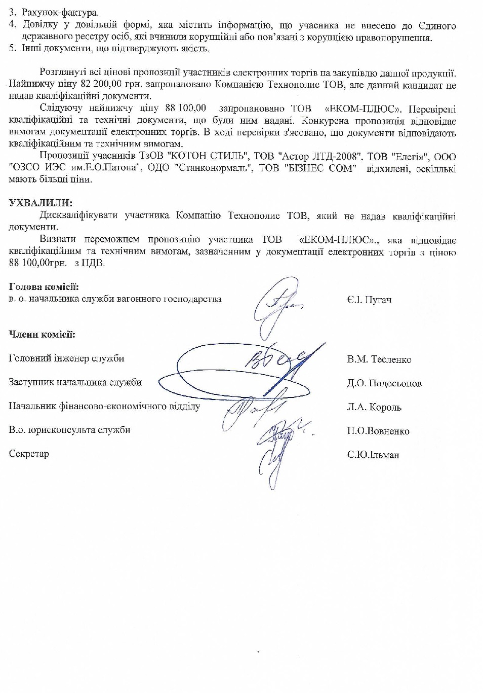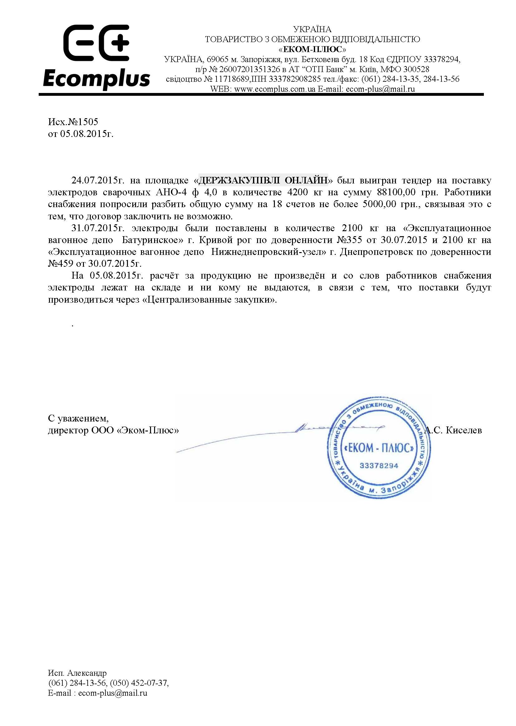 31.07.2015 вказаний товар поставлено державному замовнику у повному обсязі за кількістю та якістю. Проте, ДП «Придніпровська залізниця» відмовляється від оформлення договору постачання та, як наслідок, від здійснення оплати.Такі дії службових осіб ДП «Придніпровська залізниця» стимулють підприємців до пошуку шляхів виживання. Традиційно існувало два шляхи: тонути в збитках та збанкрутувати або придбати лояльність корупціонерів.
