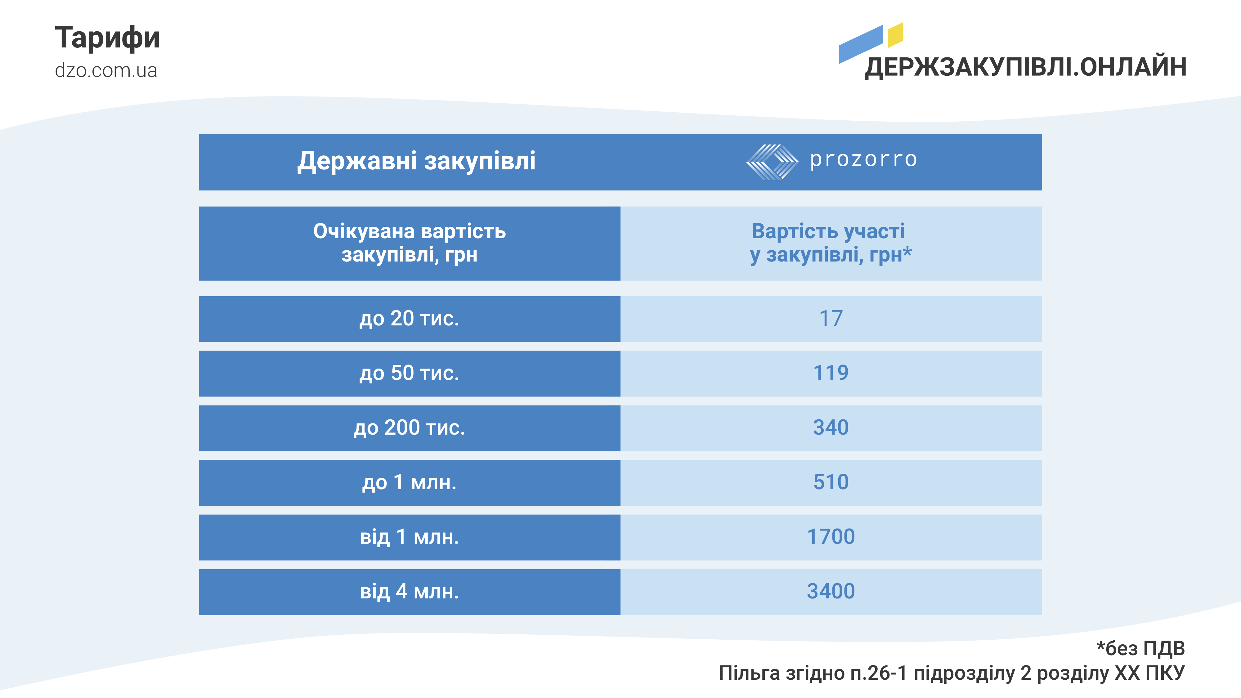 За предоставление Оператором Участнику доступа к онлайн-сервисам Электронного площадки, использование указанных сервисов для доступа к электронному каталогу «Prozorro-market» (Е-каталог), размещение ценового предложения в е-каталоге, другое, результатом которых является заключение договора между Заказчиком и Участником и завантежений в электронной системе закупок отчет о заключенном договоре Оператор электронной площадки имеет право на вознаграждение в размере 5% от стоимости заключенного договора (без НДС).