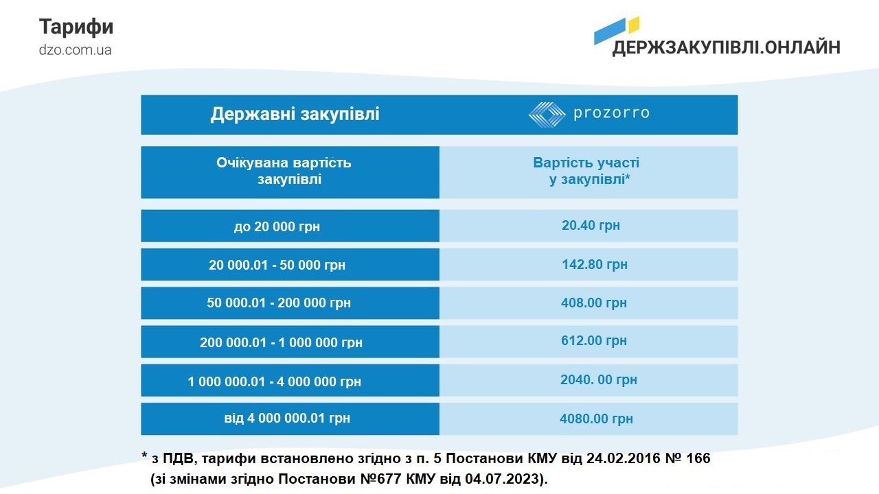 За подання учасником тендерної пропозиції та/або пропозиції учасника закупівлі, що була розкрита електронною системою закупівель через електронні сервіси з автоматичним обміном інформацією (онлайн-сервісами), доступ до яких здійснюється за допомогою Інтернету, та за користування зазначеними електронними сервісами оператор авторизованого/попередньо авторизованого електронного майданчика справляє з учасника плату в розмірі: